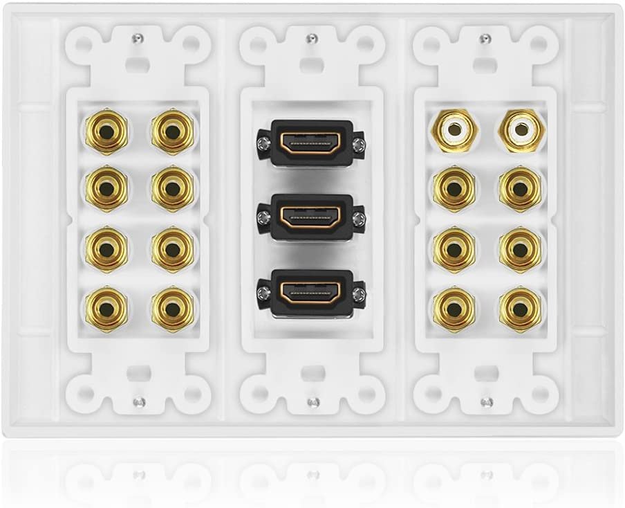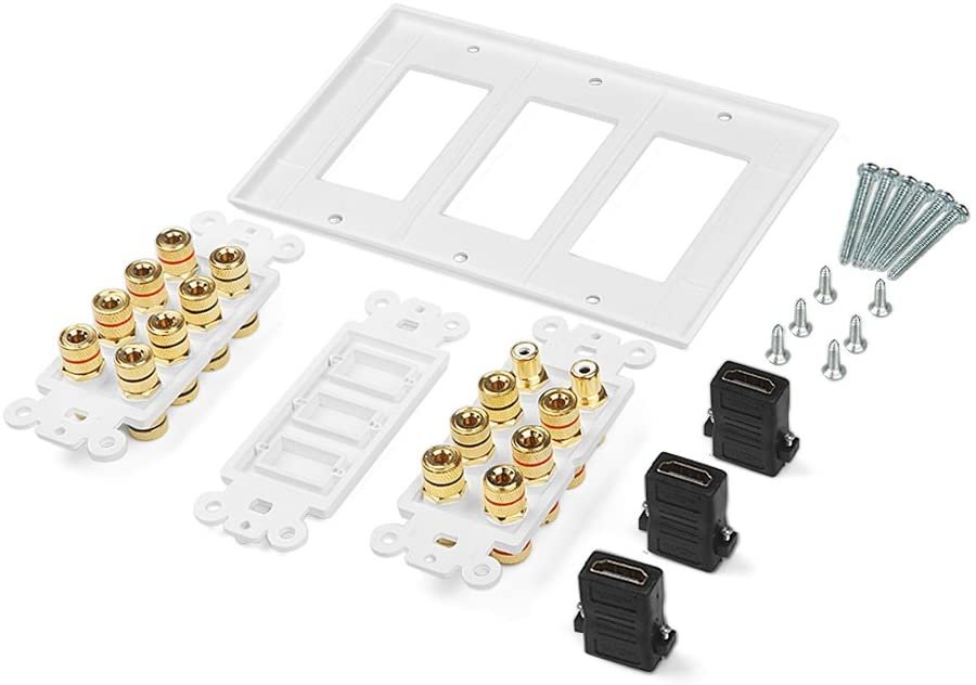 One Unit of Wall plate with 14 banana connectors, 2 RCA subwoofer connectors, 3 HDMI ports and screws required for installation